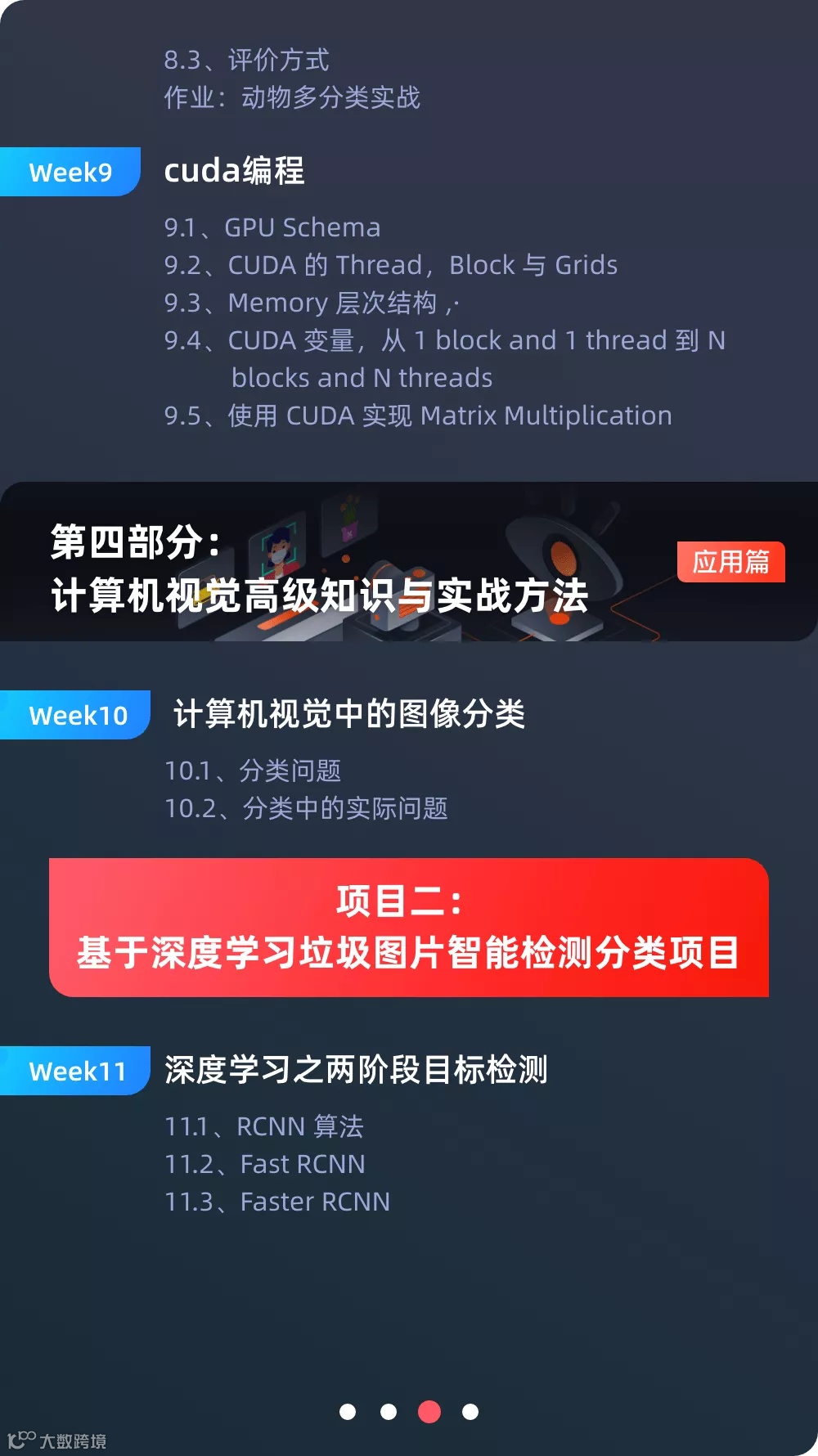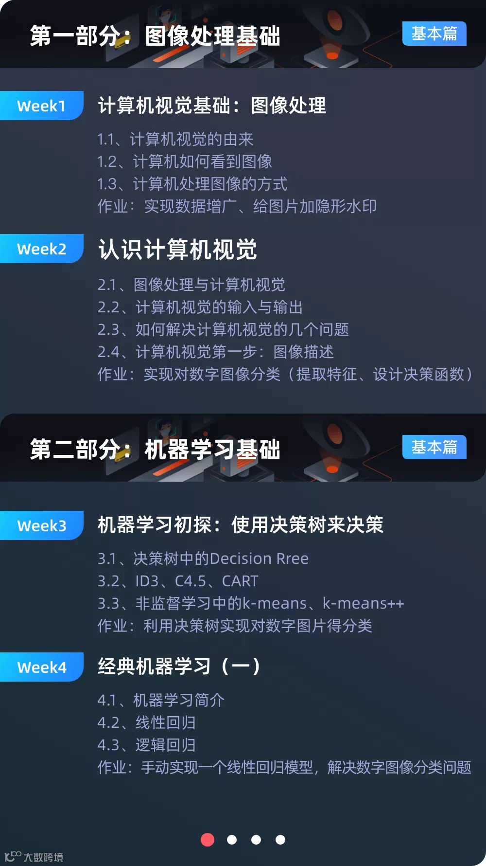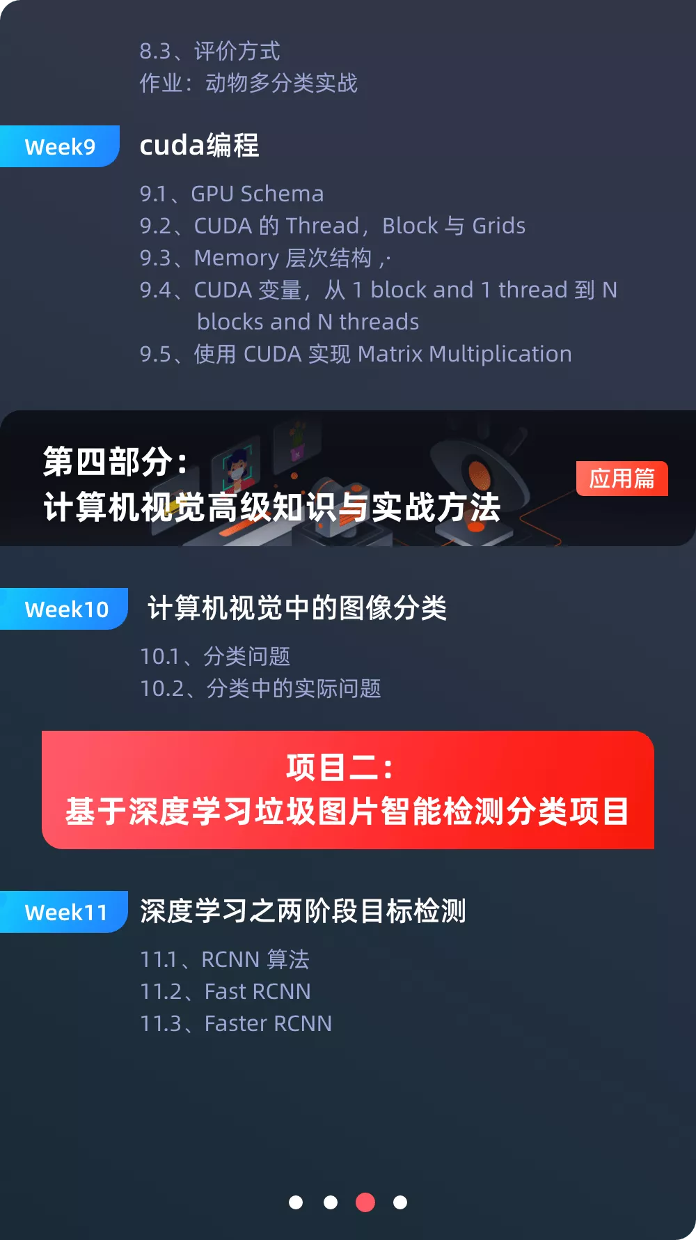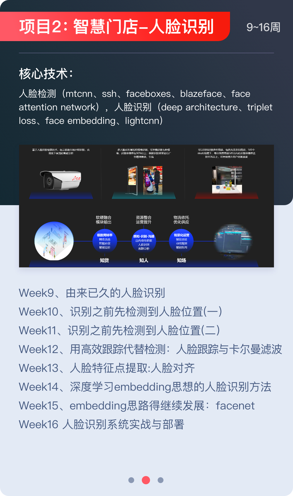 为了满足不同基础的学生需求,我们还提供了预修课、专业选修课、公选课、提升课。预修课和公选课帮助学员具备人工智能中的数学、英语、python编程、算法分析、数据分析的基础。专业选修课是CV方向的研究领域,能让学员了解该领域的发展。提升课帮助学员掌握必备的深度框架,让学员深入项目中提升自己的能力。