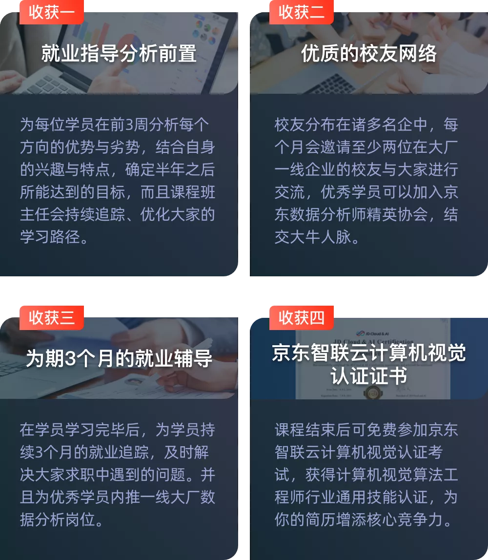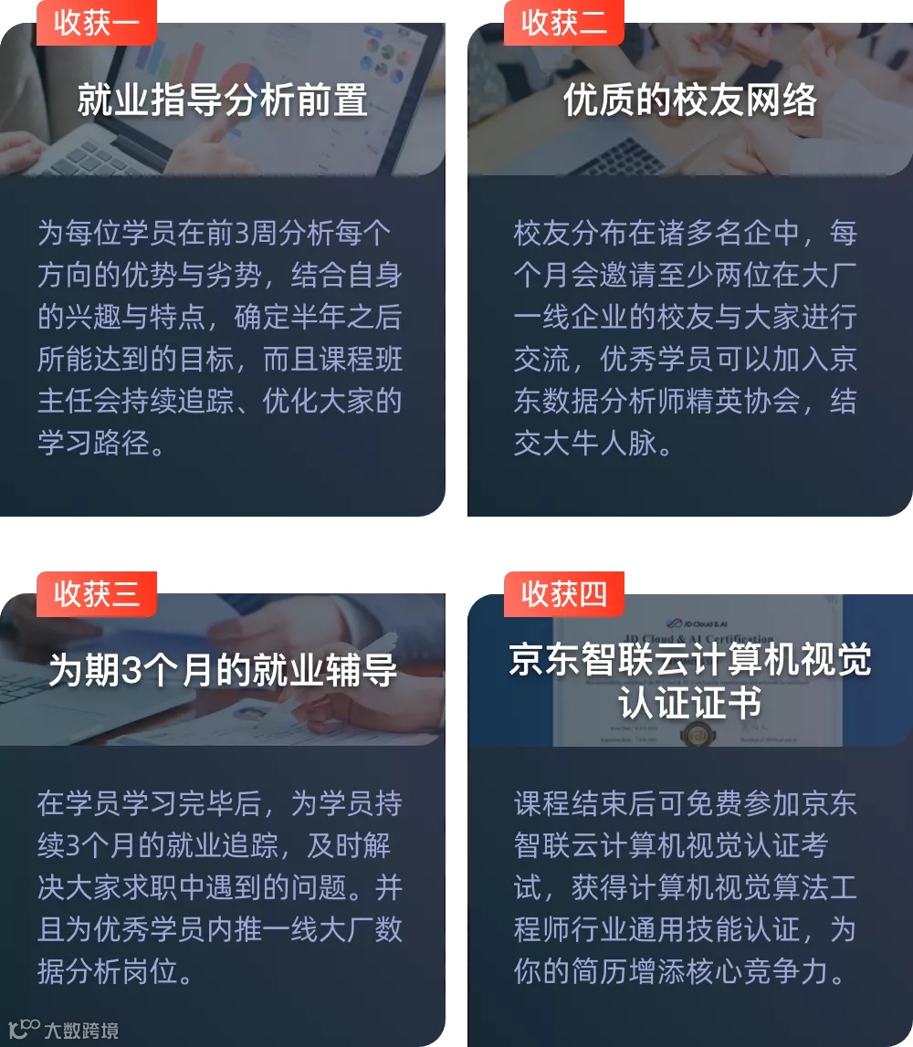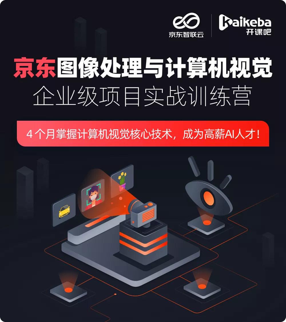 计算机视觉的大量应用,迫使需要大量的AI算法高端人才。为了培养高级CV算法工程师、AI应用人才,解决企业用人需求与求职者的就业鸿沟,京东智联云与开课吧人工智能学院联合开发,共同构建AI人才培养计划,正式推出《京东图像处理与计算机视觉实战培养计划》课程。