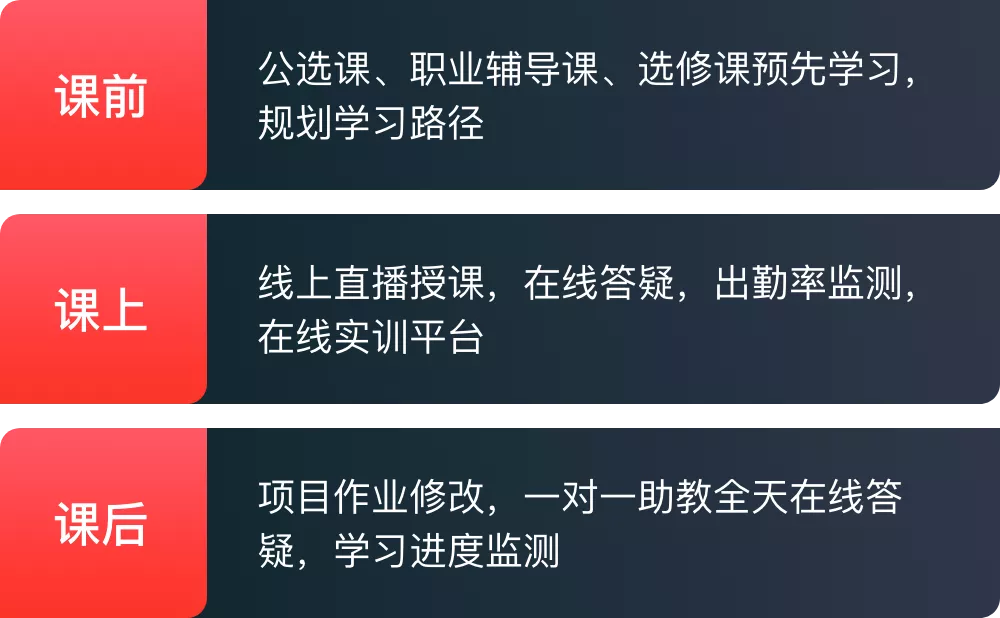 教学采用课前预习、课上答疑、课后作业的学习方式,助教1V1答疑,保姆式教学服务体系,培育高、精、尖学员。