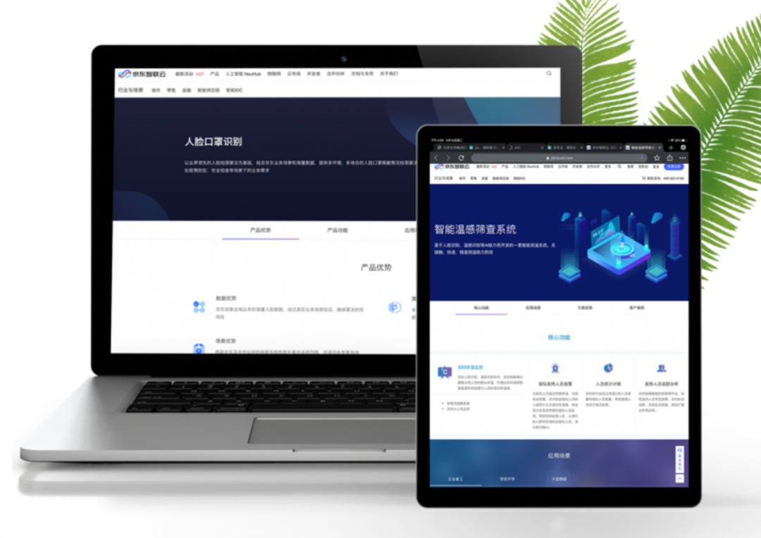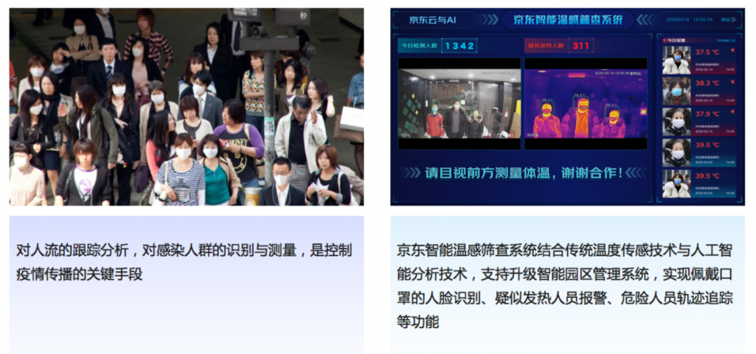 在模型部署使用时,京东智联云技术研发人员先对检测到的人脸进行口罩佩戴检测以及识别口罩是否正确佩戴,识别率达98%以上。同时,利用上述戴口罩的人脸特征模型对戴口罩的人脸进行特征提取,并与底库人脸特征进行比对,从而实现戴口罩的人脸识别。目前,口罩人脸识别模型在公开数据集LFW(添加虚拟口罩)上准确率为98.6%。