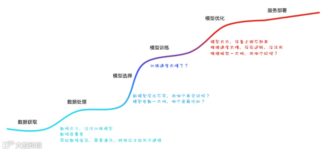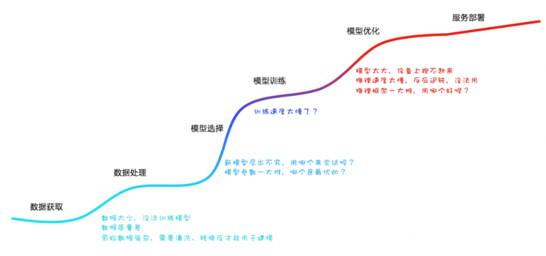 在开发模型的过程中,首先在数据处理方面,最常见的挑战就是数据量过小、质量比较差或过于庞杂,导致算法工程师需要做大量数据清洗、转换、兼容等的额外工作。同时在模型训练中,诸多参数的选择也是一个烦琐的探索尝试过程。当模型开发完成,上线前仍需进行模型优化……每一个环节都需要对AI工程师有较高的技术要求。在这样技术挑战下,就会导致AI落地的速度问题。同时为了在业务效果上领先对手,在一个业务上我们往往要投入很多算法工程师,将每一个步骤都做到极致,这样看下来,AI应用怎么可能很容易的落地呢?
