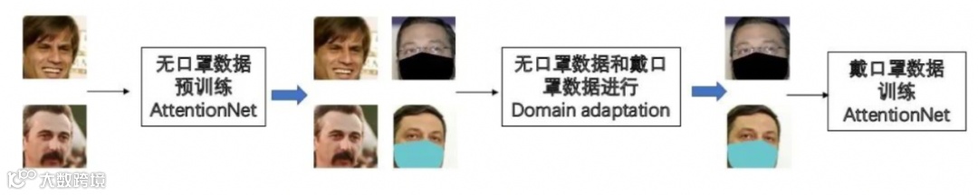 “我们还发现在不戴口罩数据上训练的模型对戴口罩的人脸依然有一定的识别能力,所以我们先在大量的不戴口罩的常规人脸数据上进行模型训练,然后再通过domain adaptation将模型迁移到戴口罩人脸识别数据上继续训练。”