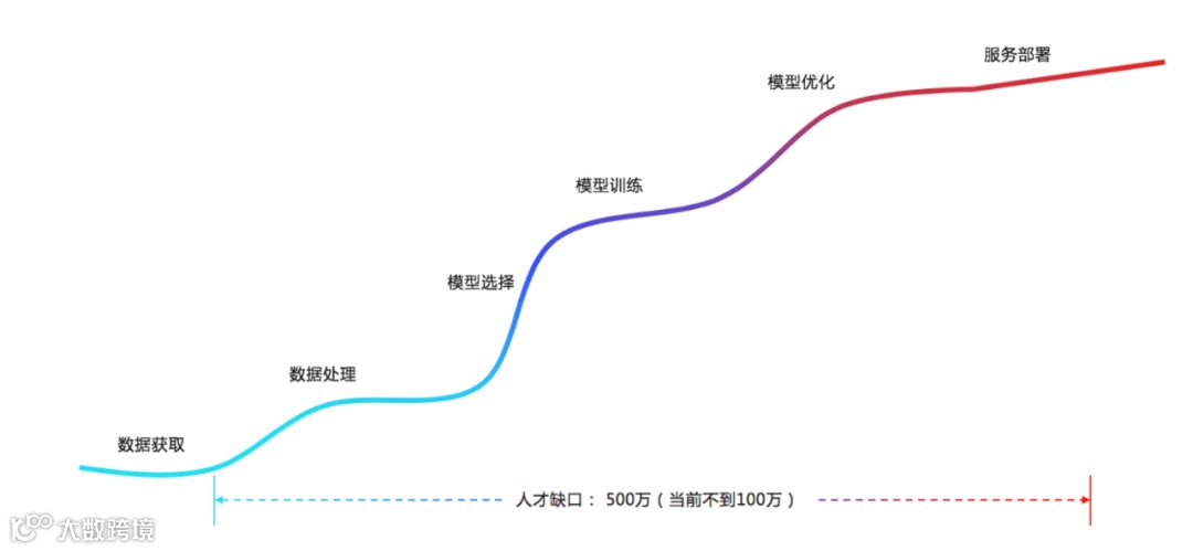 从数据获取、数据处理、模型选择、模型训练以及模型优化和最终上线,根据整个AI落地的大概生命周期,是需要在实际的生长环境里做部署的。为什么AI落地比较困难?是因为在整个生命周期里面,拥有相匹配技能的人才还是非常少的。根据一些权威机构比较一致的评测数据,中国目前的AI人才缺口大概有500万左右。可以想象,这种情况会导致大部分的AI人才被诸多大厂争夺。但是对一些有实际应用落地场景需求的小型公司及传统企业,就无法进行项目的建设和落实。同时,人才缺口短时间内难以弥补。AI落地困难重重,每一个环节上都需要AI的技术人才掌握相匹配的技术,并非是一蹴而就的。