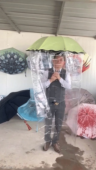 絶対雨で濡れたくない時は、傘から垂れたビニールが全身をすっぽり覆ってくれる全身傘。