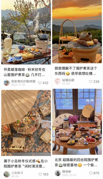 七輪を囲んで、お茶を煮出し、急須の周りにサツマイモや栗を並べて焼いて食べたり、中国のお菓子を食べたりするというのは、「セレモニー感」満載の時間となる。昨年の冬から、中国のネット上では「七輪を囲んでお茶」が高い人気を集めた。多くの人が時間を見つけては、仲の良い友達と一緒に、中国らしい趣き漂う店に行って、この「セレモニー感」満載の時間をじっくりと楽しんでいた。