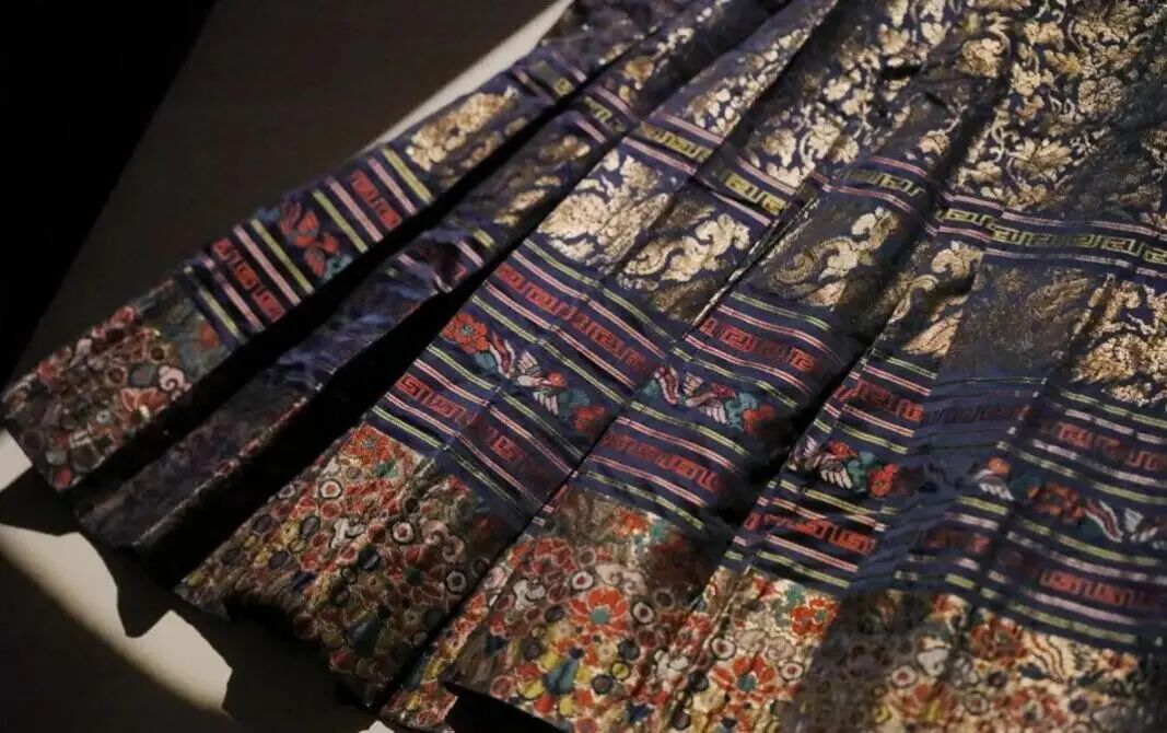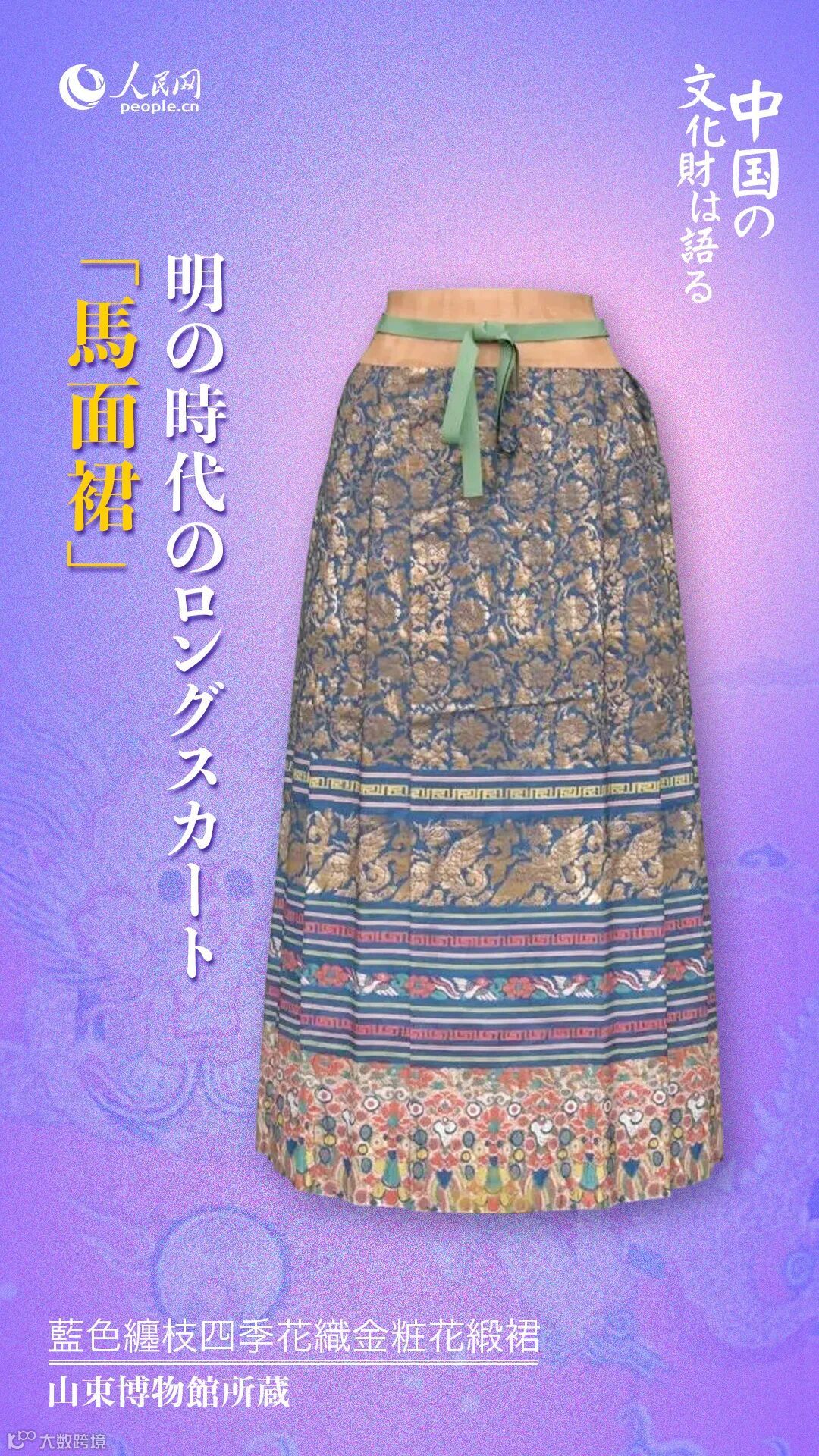 両側面にひだが入ったロングスカート「馬面裙」は、宋の時代にすでに雛形ができ、明、清の時代に流行した。では、「馬面裙」はどれほど美しいものだったのだろうか?その美の極致が「藍色纏枝四季花織金粧花緞裙」だ。