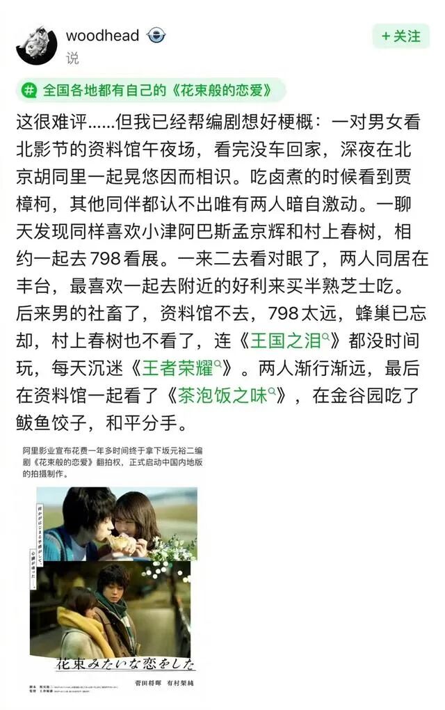 想像力豊かなネットユーザーは、中国各地のローカライズ版「花束みたいな恋をした」のシナリオを作成している。例えば、日本版で、麦と絹は、終電を逃し、一緒に入った深夜営業のカフェでたまたま人気映画監督の押井守が近くに座っているのを見つけ、それに気づいたのは自分たちだけだったため、互いにリスペクトし合うが、ネットユーザーが作成した北京版では、「北京風モツ煮込みの鹵煮を食べている時に、賈樟柯(ジャ・ジャンクー)監督に遭遇」というエピソードになっている。また、日本版では、麦と絹は初デートで、東京の科学博物館にミイラ展を見に行くのに対して、北京版では、「特別展を見るために798芸術区に行く」エピソードに、上海版では、「上海国際映画祭に行くチケットを協力して手に入れようと助け合う」エピソードで、互いの思いを深めている。