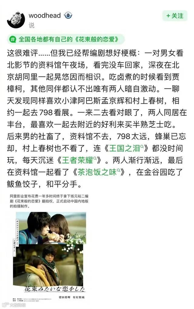同映画の脚本は、「東京ラブストーリー」や「カルテット」、「大豆田とわ子と三人の元夫」といった大ヒット映画やドラマを手掛けてきた坂元裕二が担当した。ストーリーは東京を舞台に展開されているものの、登場する多くのカルチャーやアート作品、そして若者ならではの暮らしぶりには、中国の若者も共感を覚えている。そのため、中国各地の多くのネットユーザーが先を争うかのように、日本版の文学的スタイルに、人情味あふれるそれぞれの地域の特色を加えた「○○バージョン」の「花束みたいな恋をした」のシナリオをネット上に投稿。ネットユーザーからは、「エモい」や「まるで自分自身を見ているよう」といったコメントが寄せられている。