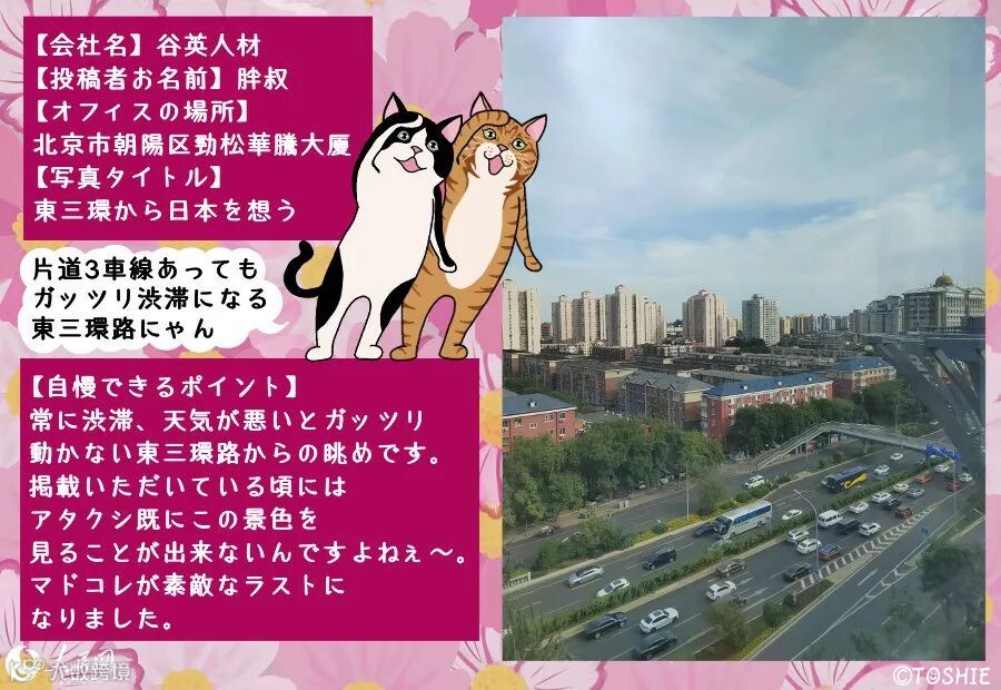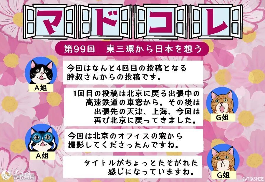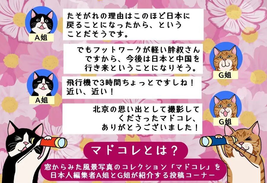 ウチのオフィスの窓からは、こんな風景またはこんなモノが見えると自慢していただく「マドコレ(窓から見た風景コレクション)」コーナー。どこまでも続く青い空や遠くに見える山々といった自然の風景から、オフィス街に建ち並ぶ高層ビルや幹線道路を走る車、庶民の暮らしが垣間見えるローカルな街並み、はたまた移動中の車窓からの眺めなどなど、高さや場所も異なれば、その窓から眺める風景も千差万別。中には仕事の意欲をアップさせてくれる元気の出る光景もあれば、疲れを癒してくれるほっこりした風景も。そんな皆さまからお寄せいただいたマドコレの数々を、毎週火曜日に、人民網日本人編集者のA姐とG姐がコメントしながら、のんびり紹介していきます。