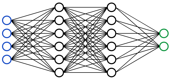 神经网络是一种受人脑启发的多层模型。就像我们大脑中的神经元一样,上面的圆圈代表一个节点。蓝色的圆圈代表输入层,黑色的圆圈代表隐藏层,绿色的圆圈代表输出层。隐藏层中的每个节点代表特定输入的一个函数,最终生成绿色圆圈中的输出。