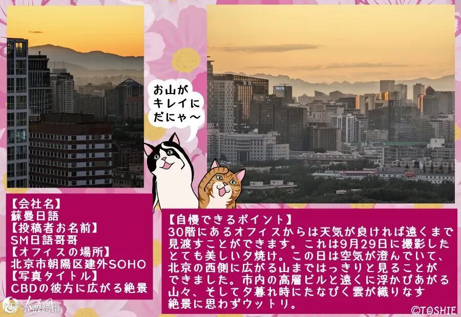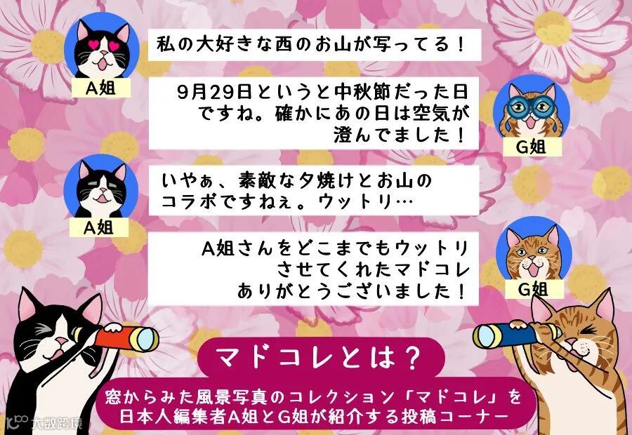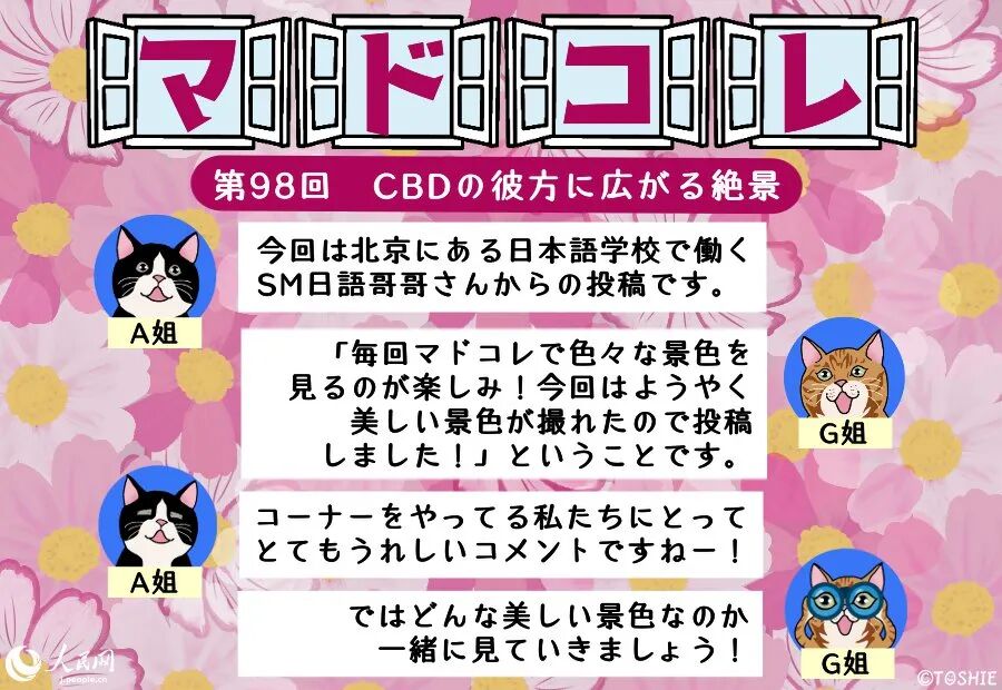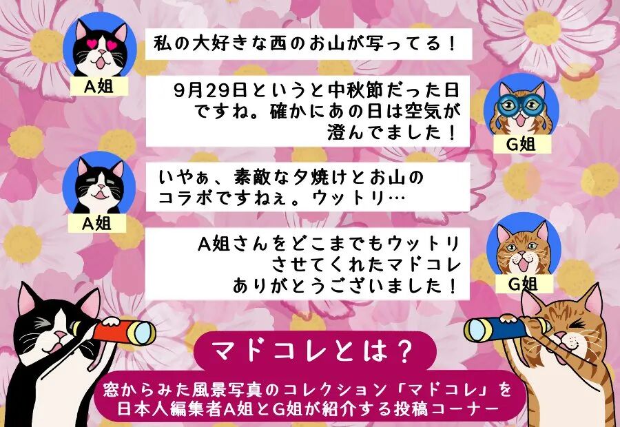 ウチのオフィスの窓からは、こんな風景またはこんなモノが見えると自慢していただく「マドコレ(窓から見た風景コレクション)」コーナー。どこまでも続く青い空や遠くに見える山々といった自然の風景から、オフィス街に建ち並ぶ高層ビルや幹線道路を走る車、庶民の暮らしが垣間見えるローカルな街並み、はたまた移動中の車窓からの眺めなどなど、高さや場所も異なれば、その窓から眺める風景も千差万別。中には仕事の意欲をアップさせてくれる元気の出る光景もあれば、疲れを癒してくれるほっこりした風景も。そんな皆さまからお寄せいただいたマドコレの数々を、毎週火曜日に、人民網日本人編集者のA姐とG姐がコメントしながら、のんびり紹介していきます。