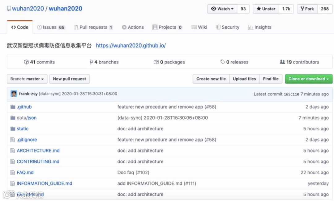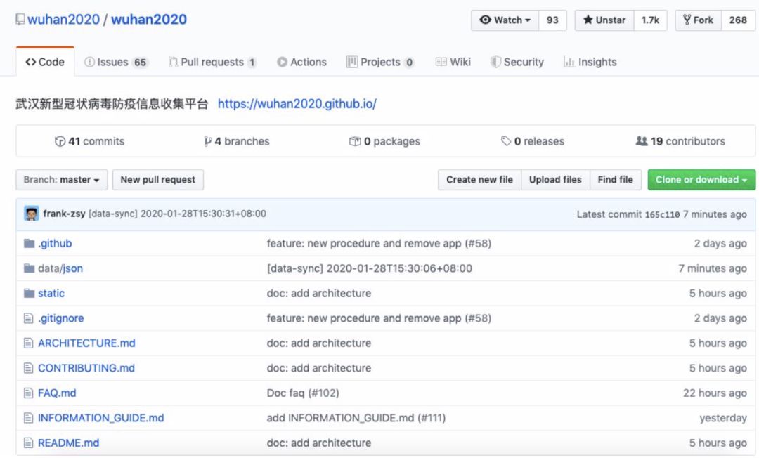 这是一个武汉新型冠状病毒防疫信息收集平台的开源项目,为什么会在 GitHub 上发起这样一个项目,其发起者撰文表示:「针对目前新型冠状病毒疫情,武汉及周边各市县均爆出物资供给不足的情况,而重大公共卫生事件在公共社会事件中属于较复杂的类型,统筹安排难度大,周期长,利用数字平台优势,让各供需方进行分布式自助对接可大幅提升效率,而目前信息采集与公布平台不一致,信息散乱很难进行有效沟通,大量图片信息不利于实时沟通。故发起该项目,旨在统一收集本次事件中相关事务处理方的信息,并利用开源和分布式协作优势实时更新并通报,提供各方的联系平台。」