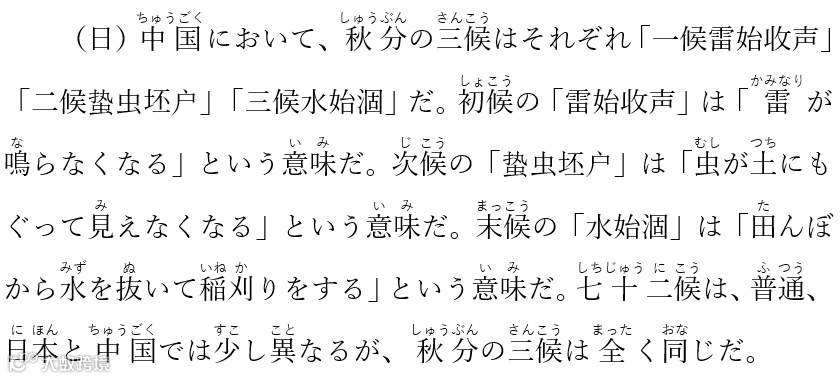 (中)在中国,秋分三候分别为“一候雷始收声、二候蛰虫坯户、三候水始涸。”一候“雷始收声”意为不再打雷。而“蛰虫坯户”则指蛰居的小虫藏入穴中,已经看不见了。三候“水始涸”是指排干水田的水,准备收割稻子。通常来说,日本每个节气的三候和中国都会有些差异,但秋分的三候,与中国完全相同。