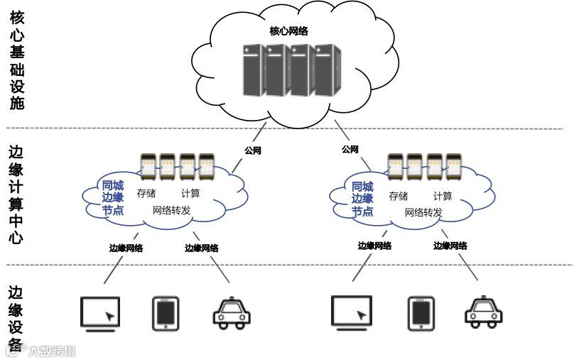 核心基础设施:提供核心网络接入,包含互联网,移动移动网络等,以及用于移动设备的集中式云计算服务和管理功能。