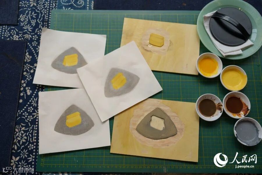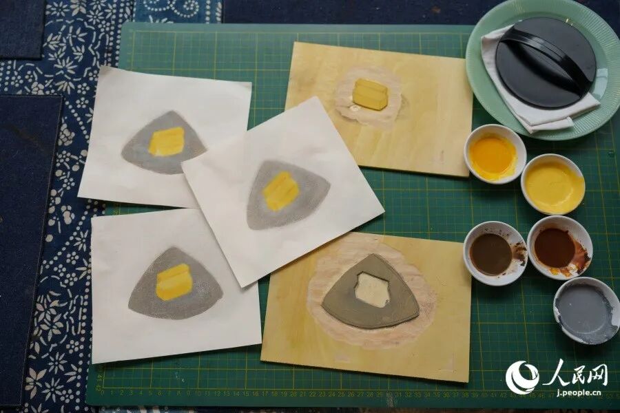 刷り上げた作品と版木(撮影・張若涵)。