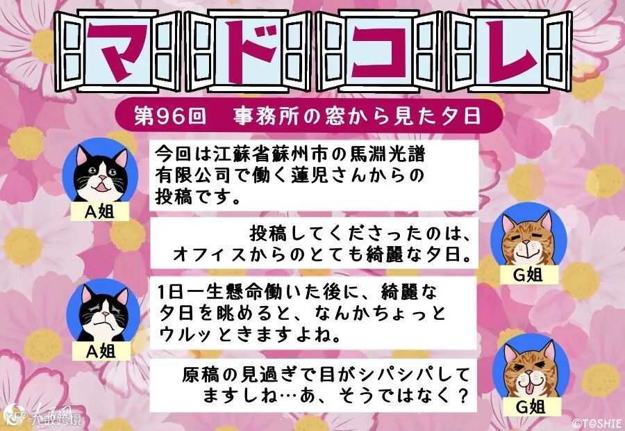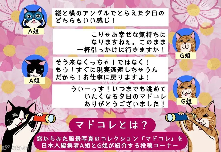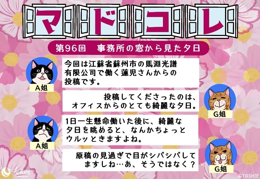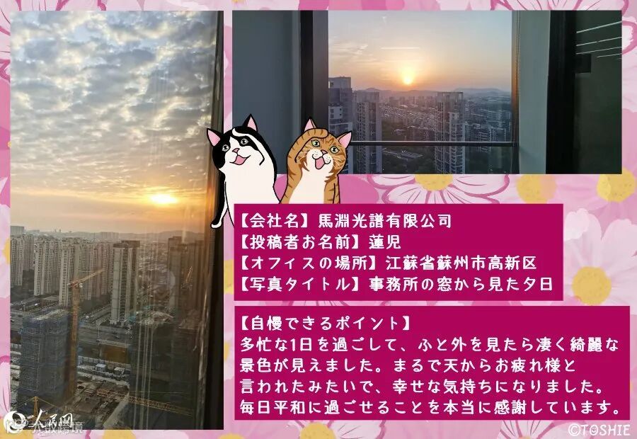 ウチのオフィスの窓からは、こんな風景またはこんなモノが見えると自慢していただく「マドコレ(窓から見た風景コレクション)」コーナー。どこまでも続く青い空や遠くに見える山々といった自然の風景から、オフィス街に建ち並ぶ高層ビルや幹線道路を走る車、庶民の暮らしが垣間見えるローカルな街並み、はたまた移動中の車窓からの眺めなどなど、高さや場所も異なれば、その窓から眺める風景も千差万別。中には仕事の意欲をアップさせてくれる元気の出る光景もあれば、疲れを癒してくれるほっこりした風景も。そんな皆さまからお寄せいただいたマドコレの数々を、毎週火曜日に、人民網日本人編集者のA姐とG姐がコメントしながら、のんびり紹介していきます。