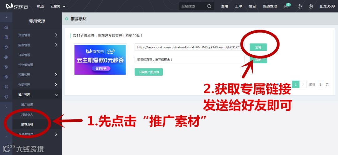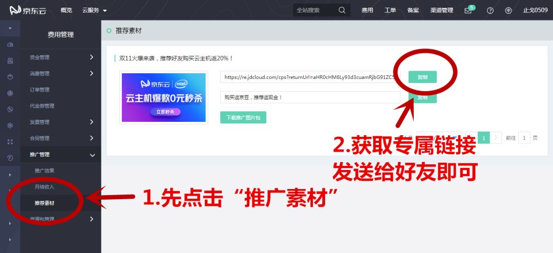 选择“推广素材”,获取自己的专属链接,发送链接给好友即可开始推广: