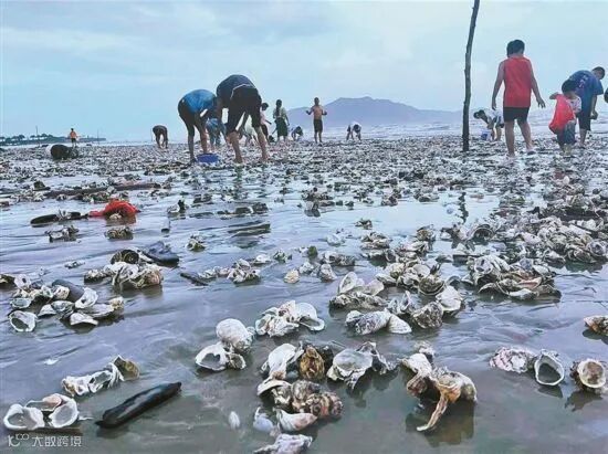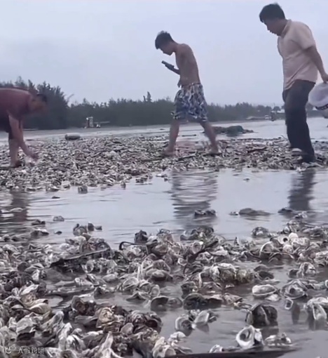 7月17日、台風4号「タリム」の上陸が迫る中、深汕特別協力区の玉海湾の砂浜にはカキが大量に打ち上げられていた。