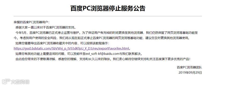 百度浏览器于9月29日在其官网发布“百度PC浏览器停止服务公告”,正式宣布其有着8年历史的百度PC浏览器即刻终结。事实上,早在今年5月,百度PC浏览器便已经部分停止运营与维护,当时相关的产品包括桌面百度、百度工具栏、百度地址栏、百度极速浏览器,hao123浏览器不再更新,为了保证用户有充裕的时间更换至其他浏览器,其仍然保留了网页浏览等基础功能至今。