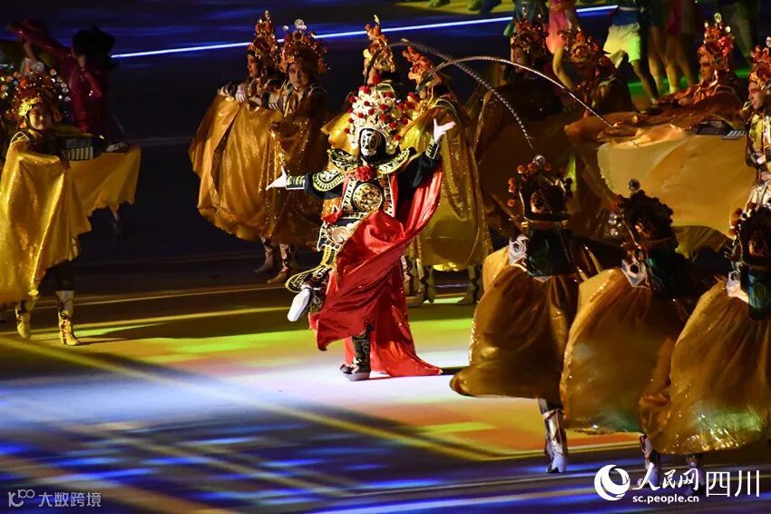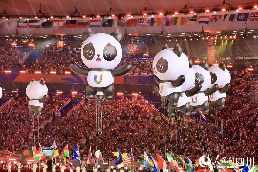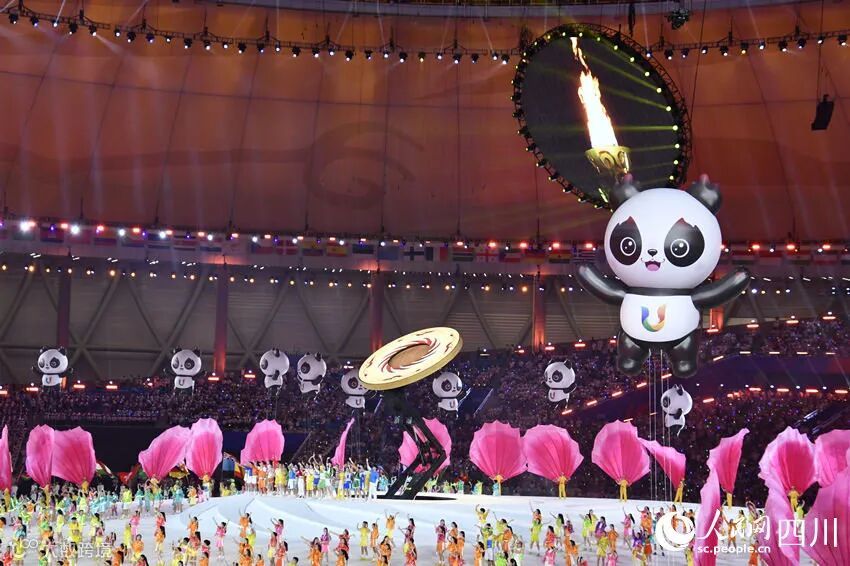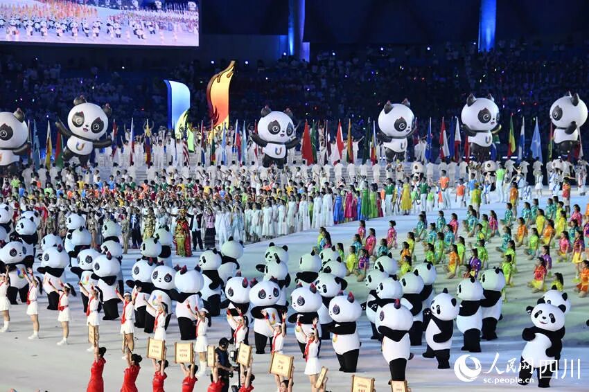 開幕式のパフォーマンス「青春の光」では、青春の夢を追う若者が熱意をもって上を目指して登攀し、模索を止めず、光への飛翔を永遠に追い求めることを示した。「青春の友情」では、若い大学生が全力で駆け抜け、活力を発揮することを示し、スポーツが人々にもたらす喜びと情熱を表現した。「青春の夢の実現」では、トーチを手にした31人が成都ユニバの夢の火を同時に点し、世界の大学生が平和と発展を共同で推進するという希望の火を点し、人類運命共同体の共同構築という奮進の火を点した。最後のパフォーマンス「陽光の下の団欒」は、運命を共にして、夢をかなえることを表現し、若い大学生らが主題曲「夢の成就」を合唱した。