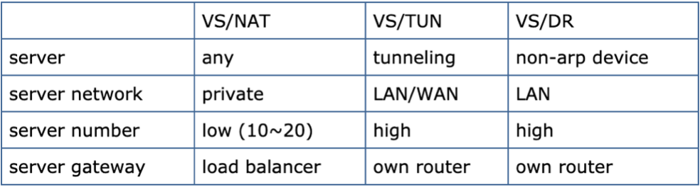 以下小节将解释它们的优缺点。VS/NAT,VS/TUN 和 VS/DR的比较总结在下表中: