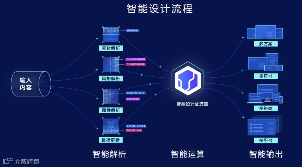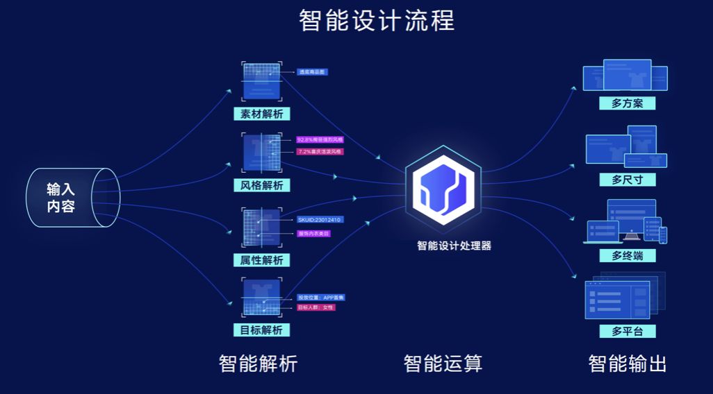 用户将需要解析的内容传入,由智能设计引擎对输入内容进行识别与分析,之后通过智能设计处理器进行处理,完成用户需要的操作,最终产出设计结果。替代设计师人工设计,手动操作,将设计结果规范化、精细化、自动化,稳定输出。