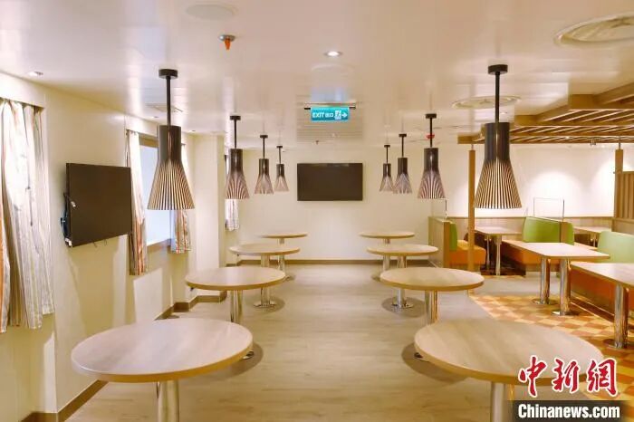 内装が完了した船内の船員用レストラン。(撮影・殷立勤)