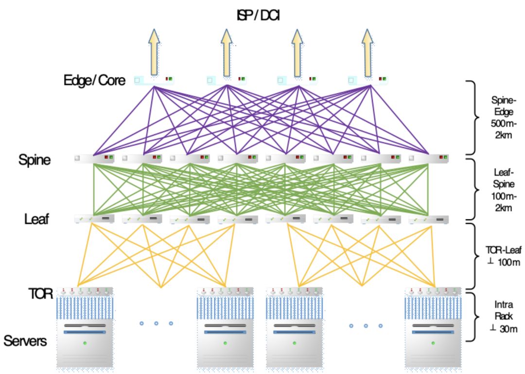 数据中心网络内部互联速率上升到吉比特之后,光互联因其带宽、连接距离和易部署等优势而被大量使用。随着网络规模的扩大,特别是随着云业务的发展,东西向流量急剧增加,能占到总流量的70%左右。这就使得数据中心内部的网络节点数越来越多,互联端口的类型也越来越丰富。光模块在数据中心的使用数量成指数增长,光互联对网络系统稳定性的影响日趋加大,在网络硬件成本中的占比也相当可观。