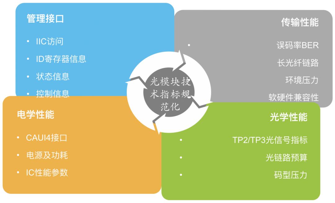 作为可插拔组件,光模块要适应来自不同厂家的不同类型的网络设备,这就需要统一的技术指标来实现最广泛的兼容性。MSA作为业内普遍遵循的光模块技术规范,定义了电气特性、连接器、管理接口及机械结构等基本规则。但是MSA的限制相对来说比较宽松,不同的厂家在具体执行时不尽相同。网络建设者需要根据自身的应用需求和运维习惯来完善和细化技术要求,不但对光模块提出要求,同时也对网络设备光端口提出技术要求。