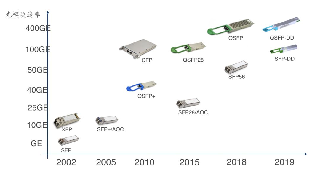 网络设备互联的应用场景日益丰富,光模块的技术方案也随之不断发展,从传统的分立器件、化合物半导体芯片发展到光学集成PIC、硅基光子SiP,光互联技术始终按照摩尔定律向高速、集成、低功耗的方向发展。下图列出数据中心用到的模块类型演进路线。面对众多的光模块类型和互联方案,需要根据网络所承载的业务需求灵活选择,在优化网络性能的同时降低综合成本。