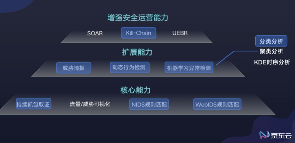 态势感知的核心能力包括持续抓包取证、流量/威胁可视化、网络入侵检测系统规则匹配、WebIDS规则匹配。扩展能力主要体现在威胁情报、动态行为检测和机器学习自动检测引擎,机器学习自动检测引擎里面又分为分类分析、聚类分类和KDE时序分析。