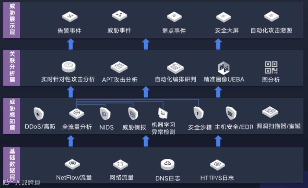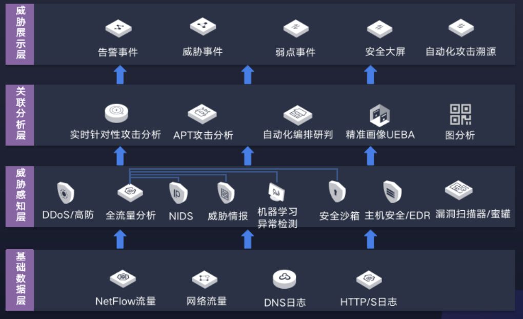 第四层是威胁展示层,主要是通过告警事件、威胁事件、热点事件、安全大坪、自动化攻击溯源给用户展示,降低用户调查取证的时间,提升效率。