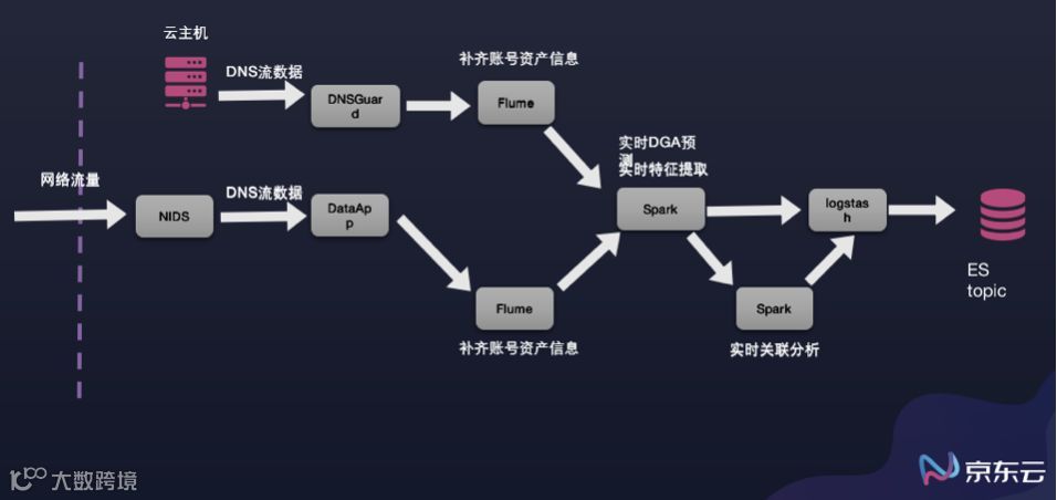 首先检测通过两条路,第一条路是NIDS的DNS流数据,通过程序补齐账号之后发到Spark里面进行特征提取匹配,然后进行预测;第二条路是云主机上,比如说自己设定了公网DNS解析的话,它发送的数据也是通过DNS解析来进行补齐资产来进行实时检测。