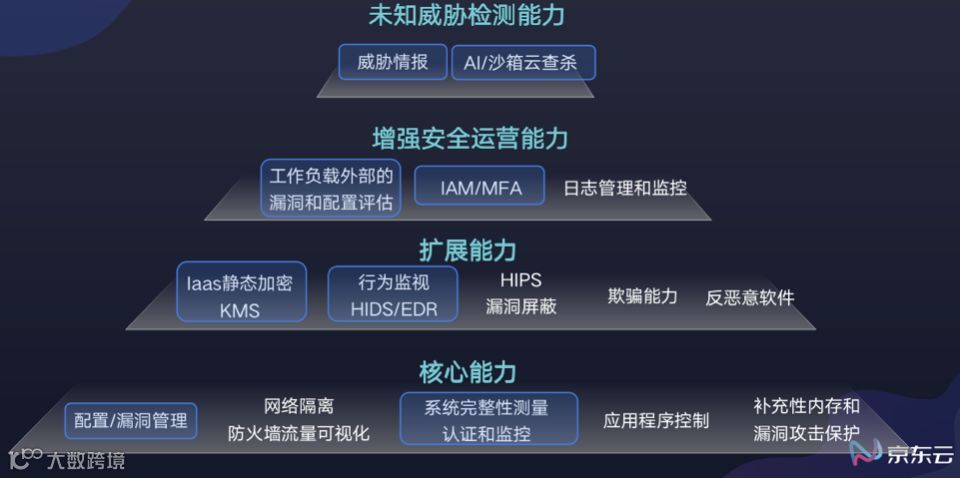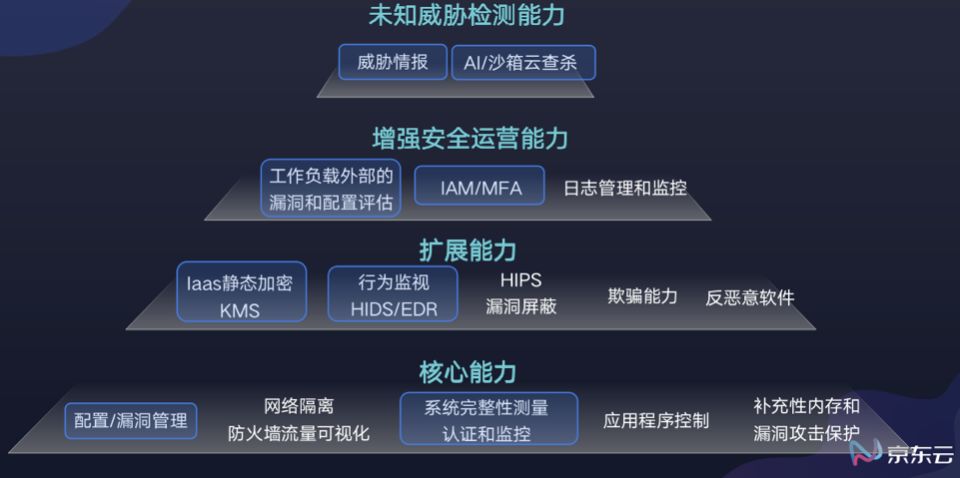 扩展能力中的行为监控HIDS/EDR能力是云端主机层面防护软件中最重要的,其它还包括静态加密KMS、HIPS漏洞屏蔽、欺骗能力和反恶意软件。增强安全运营能力包括工作负载外部的漏洞和配置评估、IAM/MFA、日志管理和监控。未知威胁检测能力需终端集成威胁情报、AI/沙箱云查杀。