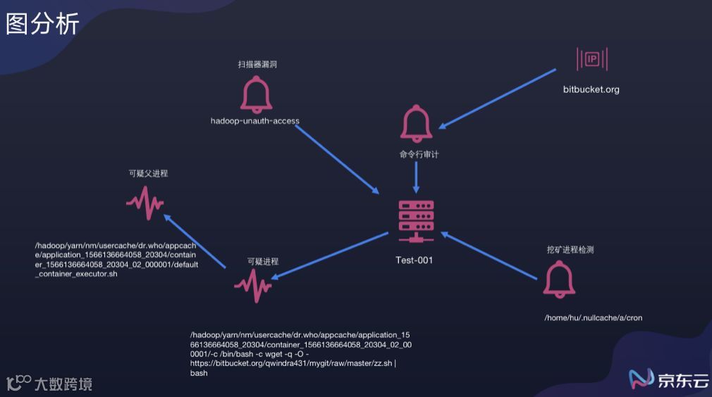 通过时间推移的方式,通过上下文关联来进行检测,关联之后发现了一条命令行审计规则,也就是通过其中一个可疑进程来下载了挖矿的脚本并且运行了。挖矿脚本的副进程是用户自己创建的一个Hadoop的进程,也就是Yarn进程。Yarn进程其实是Hadoop未授权访问的RCE的漏洞。同时通过扫描器来进行扫描检测这台主机,发现这台主机确实存在Hadoop RCE的漏洞,这便是自动化攻击溯源,里面的核心技术就是图分析的技术。