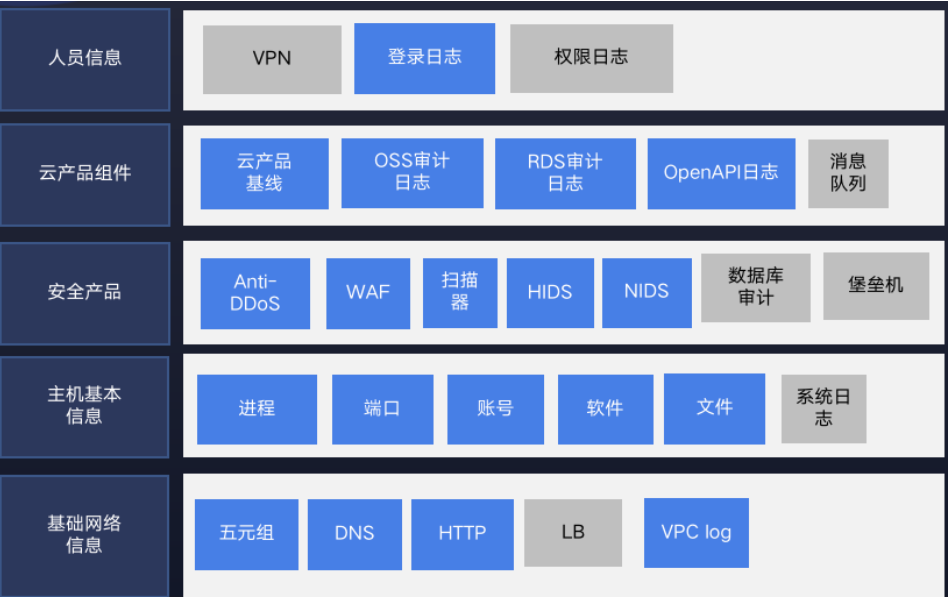 云产品组件的云产品基线,配置失败可能引起的漏洞;还可以对OSS审计日志、RDS审计日志、OpenAPI日志的风险访问行为进行分析。还有人员信息中的VPN、登录日志和权限日志。这些都可以帮助态势感知更好的进行分析。