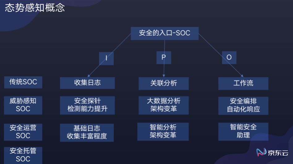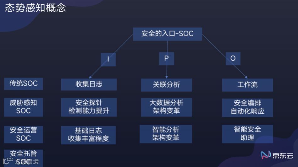 随着技术的发展,态势感知会继续往下发展,下一个极端是基于安全运营的SOC,比上一代的威胁感知SOC多了基础日志收集丰富程度。通过智能分析架构来做处理,例如机器学习、图分析等技术。