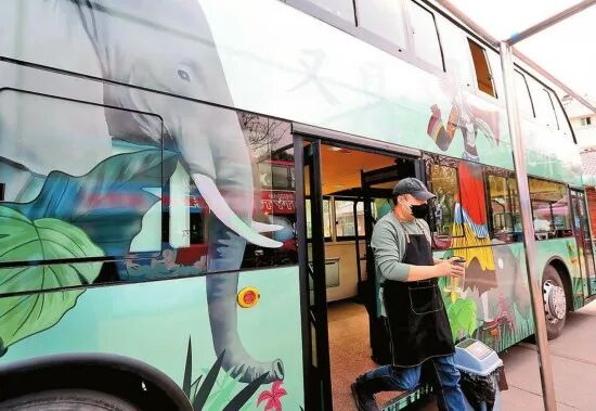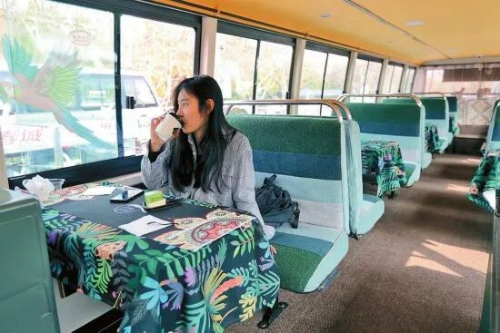 「展望」バスのスタッフである楊成勇さんによると、バスでは現在、コーヒーやプーアル茶などのドリンクのほか、スイーツやケーキも提供されている。今後は利用者のニーズに合わせて、ピザやミルクティーといった商品も販売する予定という。
