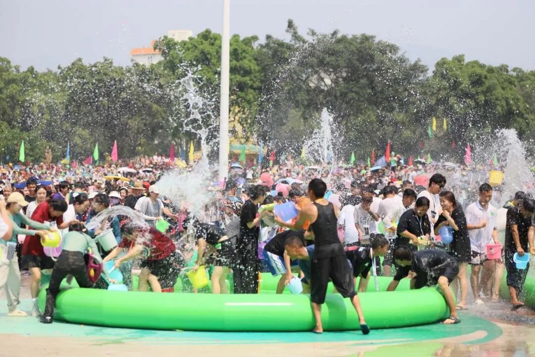 (中)4月12日,云南省德宏傣族景颇族自治州芒市,数万名各族群众身着节日盛装,泼水相庆、互送祝福,欢度泼水节。