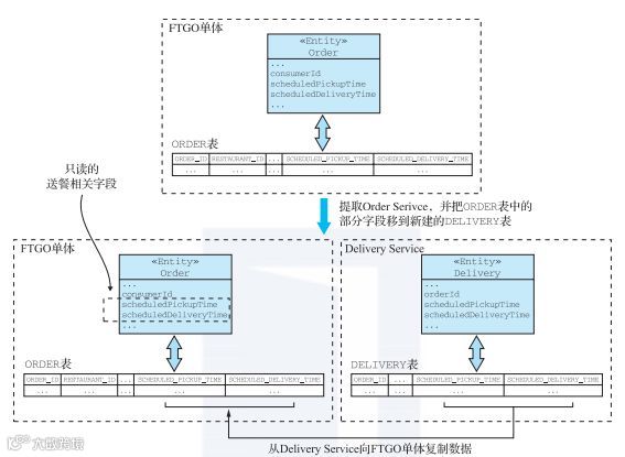 提取服务通常比将整个类移动到服务中的工作量要大得多。拆分领域模型面临的更大挑战是提取嵌入在具有其他职责的类中的功能。这个问题经常出现在具有过多职责的上帝类(God Class)中。例如,Order 类是FTGO应用程序中的上帝类之一。它实现了多种业务功能,包括订单管理、送餐管理等。Delivery 实体会实现之前与Order类中的其他功能捆绑在一起的送餐管理功能。