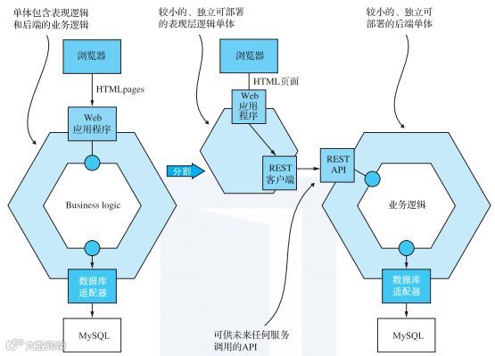 以这种方式拆分单体应用有两个主要好处。它使你能够彼此独立地开发、部署和扩展这两个应用程序。特别是,它允许表现层开发人员快速迭代用户界面并轻松执行A/B测试,而无须部署后端。这种方法的另一个好处是它公开了业务逻辑的一组远程API,可以被稍后开发的微服务调用。