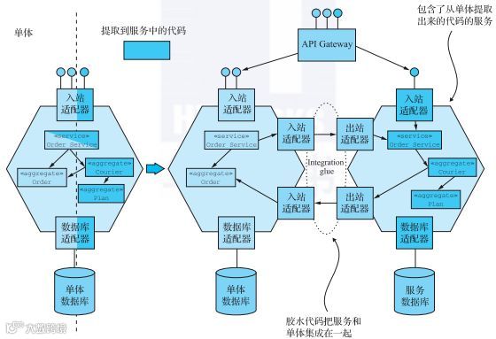 图3 通过提取服务来打破单体。你可以识别一系列功能,包括业务逻辑和适配器,以提 取到服务中。你将该代码移动到服务中。新提取的服务和单体通过集成胶水提供的API 进行协作。