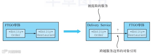为了提取服务,你需要从单体的领域模型中提取服务相关的领域模型。你需要进行大动作来拆分领域模型。你将遇到的一个挑战是消除跨越服务边界的对象引用。保留在单体中的类可能会引用已移动到服务的类,反之亦然。例如,想象一下,如图 4 所示,你提取了Order Service,其Order类引用了单体的Restaurant类。因为服务实例通常是一个进程,所以让对象引用跨越服务边界是没有意义的。你需要消除这种类型的对象引用。