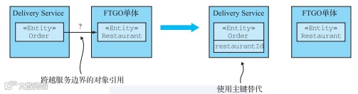 图 5 Order 类对 Restaurant 的引用将替换为 Restaurant 的主键,以消除跨越进程边界的对象引用。