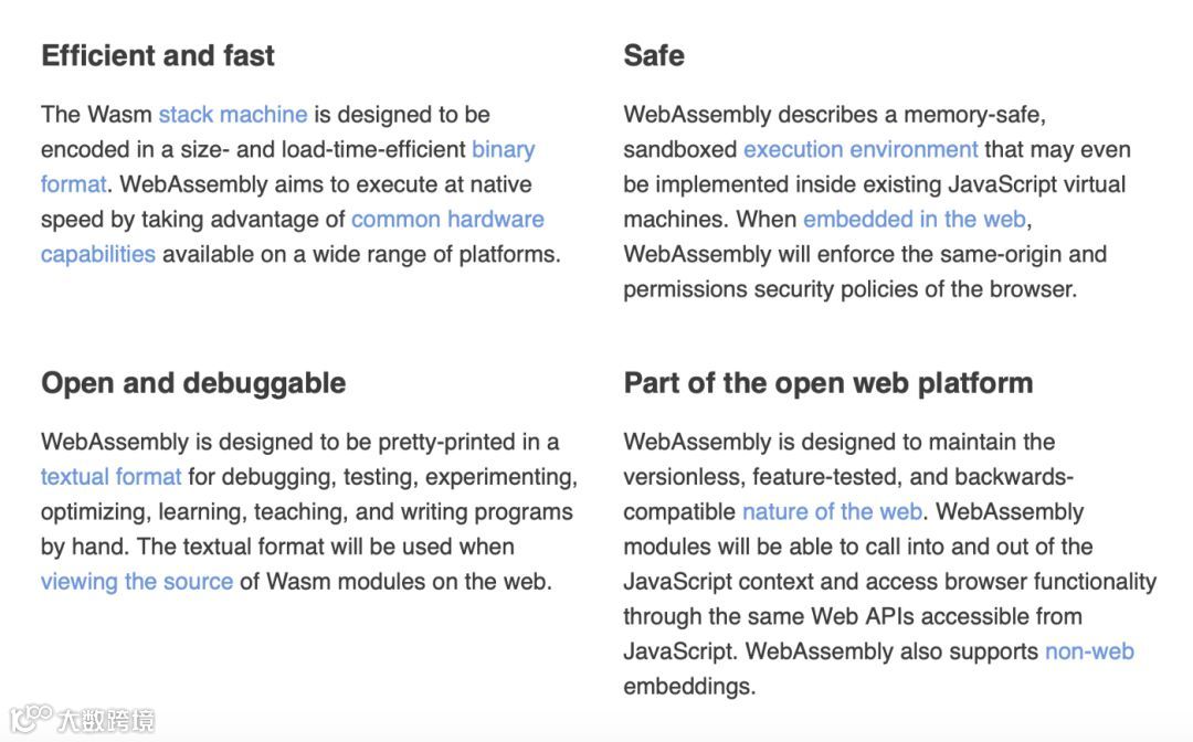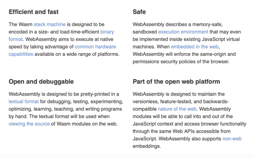 WebAssembly(缩写为Wasm)是一种基于堆栈的虚拟机的二进制指令格式。Wasm被设计为编译高级语言(如C、c++和Rust)的可移植目标。Wasm还支持在web上部署客户机和服务器应用程序。PWAs也可以使用Wasm。