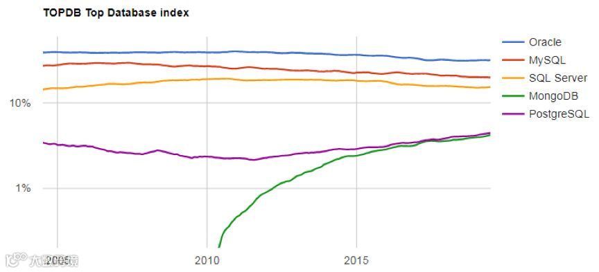 其中,MongoDB和PostgreSQL 的份额增长最直观易见,两者目前都保持着激烈的上升趋势。除此之外,Redis、SQLite、DB2和Neo4j 这些相对小众的数据也保持着增长的趋势。