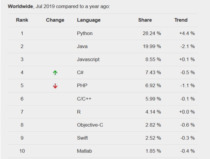 PYPL(PopularitY of Programming Language,编程语言流行指数) 7 月份的榜单已发布,目前包含四个排行榜,囊括编程语言、IDE、ODE(Online IDE) 以及数据库四大领域。PYPL 是非常流行的参考指标,其榜单数据的排名均是根据榜单对象在Google 上相关的搜索频率进行统计排名,原始数据来自Google Trends,也就是说某项语言或者某款IDE 在Google 上搜索频率越高,表示它越受欢迎。