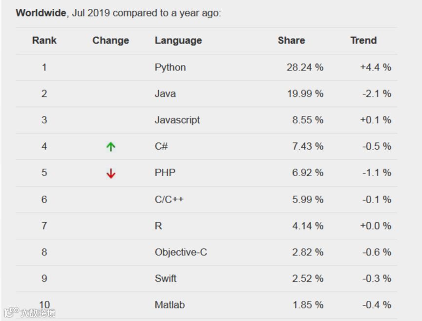 从全球范围来看,Python目前还是最流行的语言,它的份额在过去5 年中增长最多,增长了17.9%。另一边,堪称“霸主”的Java 的份额则有了不小的下降,5 年来下降了6.7%,由此前的第一名到现在份额被Python 远远领先。