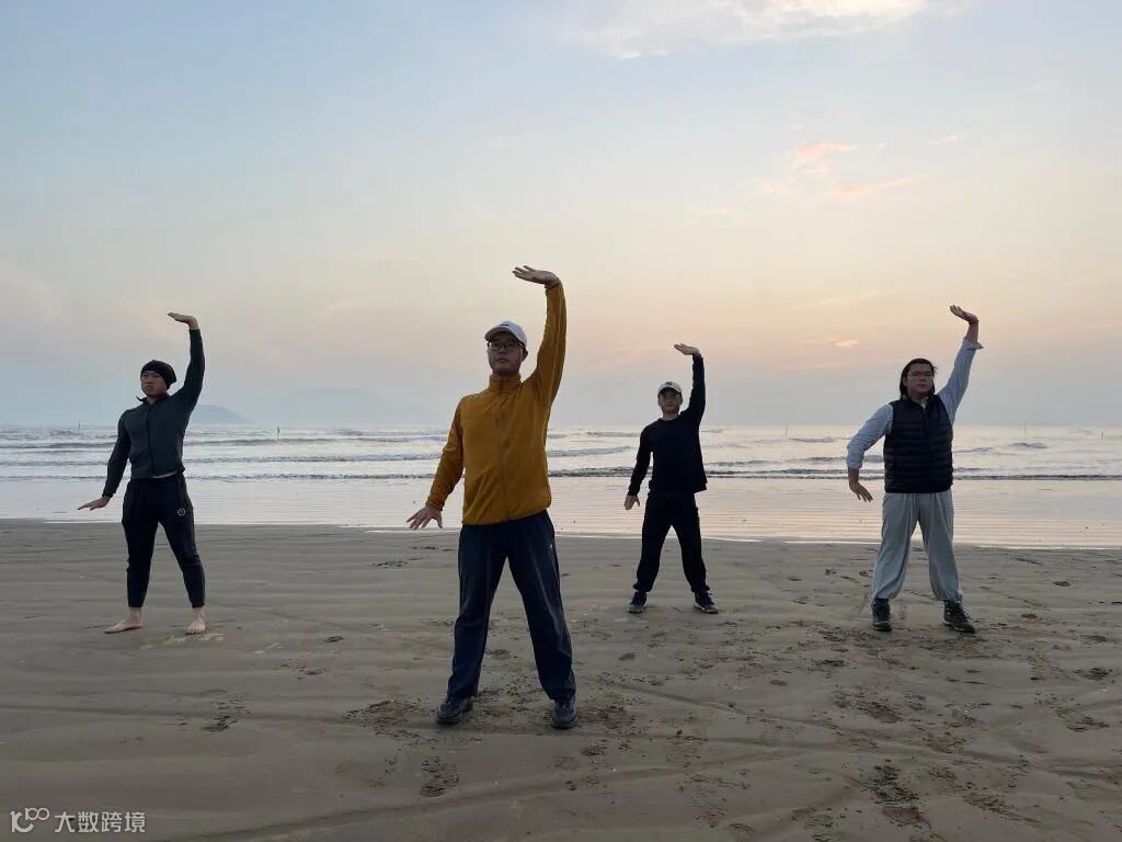 友人と一緒に海辺で八段錦を練習する姜南さん(写真左から2番目)。