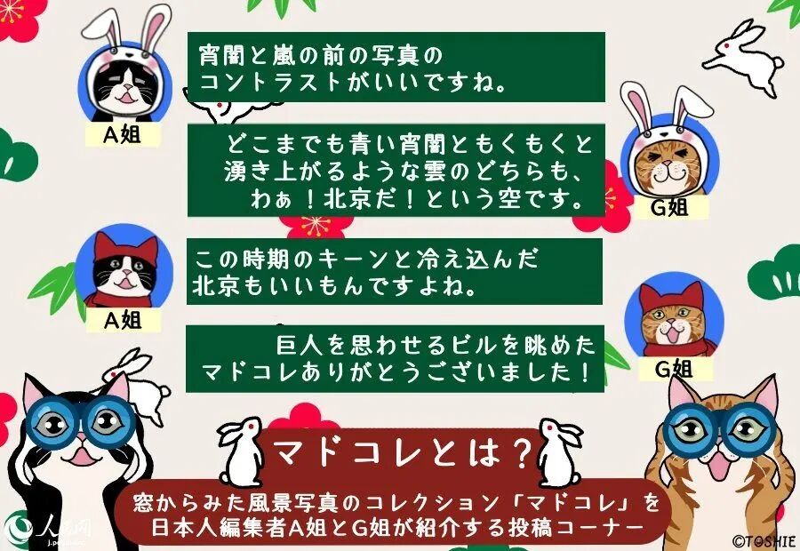 ウチのオフィスの窓からは、こんな風景またはこんなモノが見えると自慢していただく「マドコレ(窓から見た風景コレクション)」コーナー。どこまでも続く青い空や遠くに見える山々といった自然の風景から、オフィス街に建ち並ぶ高層ビルや幹線道路を走る車、庶民の暮らしが垣間見えるローカルな街並み、はたまた移動中の車窓からの眺めなどなど、高さや場所も異なれば、その窓から眺める風景も千差万別。中には仕事の意欲をアップさせてくれる元気の出る光景もあれば、疲れを癒してくれるほっこりした風景も。そんな皆さまからお寄せいただいたマドコレの数々を、毎週火曜日に、人民網日本人編集者のA姐とG姐がコメントしながら、のんびり紹介していきます。